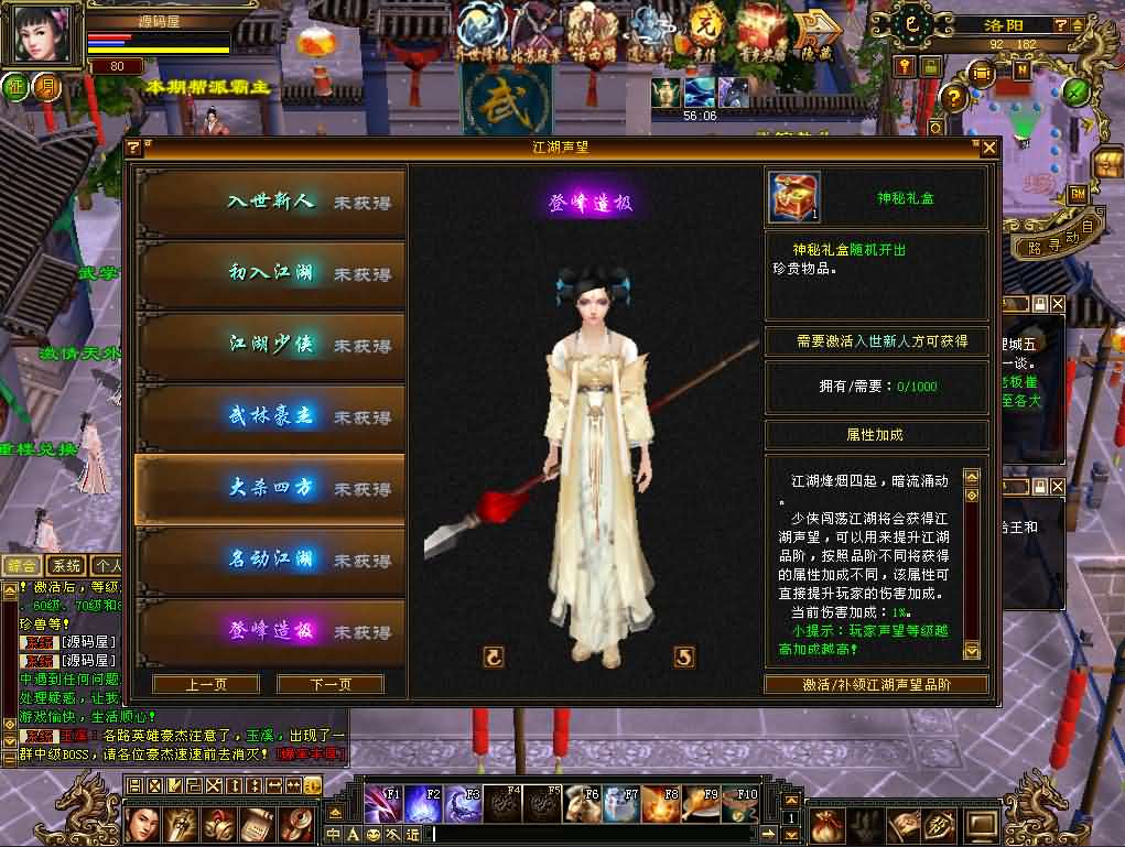 ★★独家特色:江湖声望可以用来提升江湖品阶,按照品阶不同将获得的属性加成不同,该属性可直接提升玩家的伤害加成