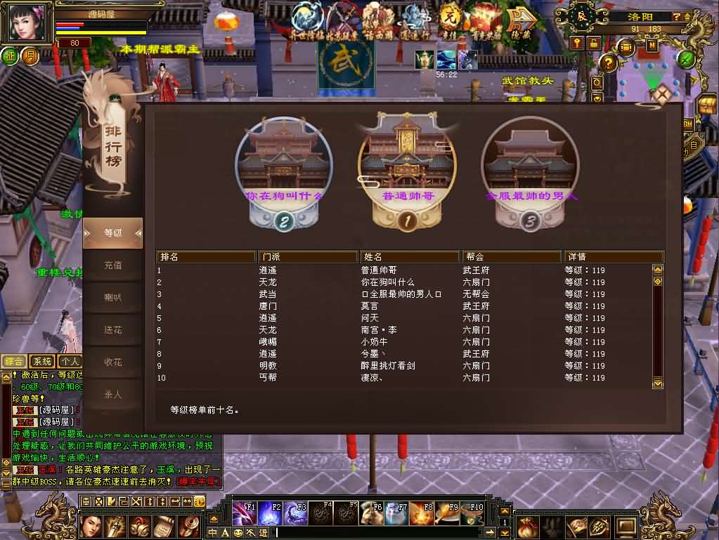 ★★独家特色:新加排行榜 等级,充值,送花,收花,喇叭,杀人,可展示前十名的排名